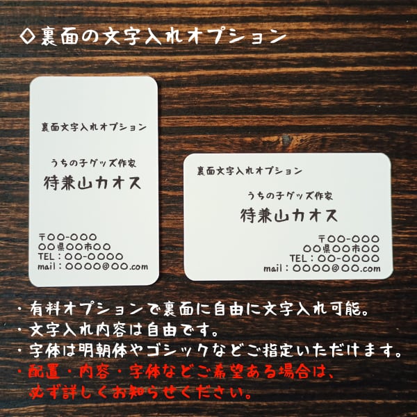 ※ウラ面の文字入れは配置・字体・行数などご希望を詳しくお知らせいただけましたら可能な限り対応させていただきます。できる限りご希望内容を詳細にお知らせ下さいますようお願いいたします。